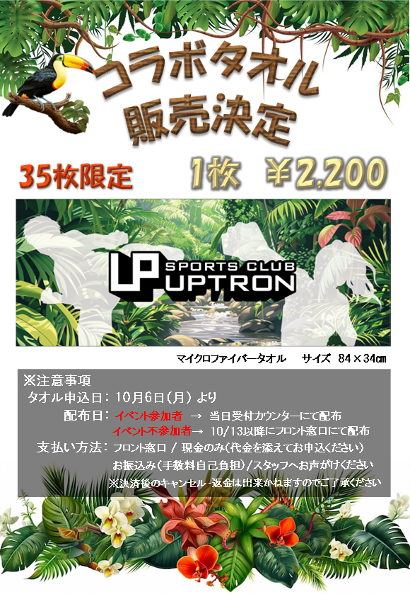 10月12日(日)のイベントに合わせて限定コラボタオルを販売いたします。数量限定につき無くなり次第終了となります。ぜひこの機会にお早めにお申込みください。また、購入者の中から5名様にサイン付きタオルが当たります‼