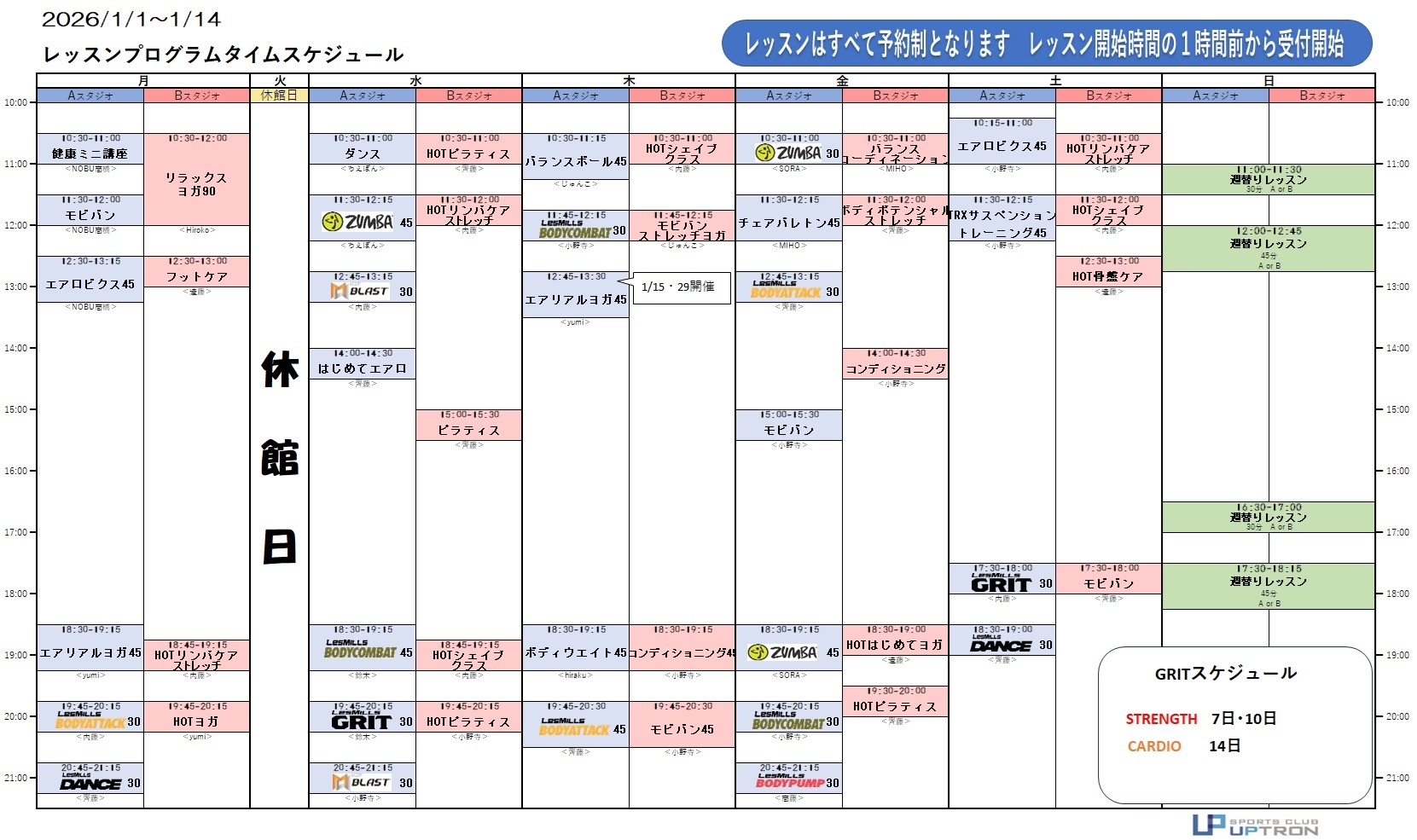 週替わりレッスン内容については、別途週替わり項目にてご参照ください。 急遽代行や変更等が生じる際は、代行一覧項目にてご確認ください。